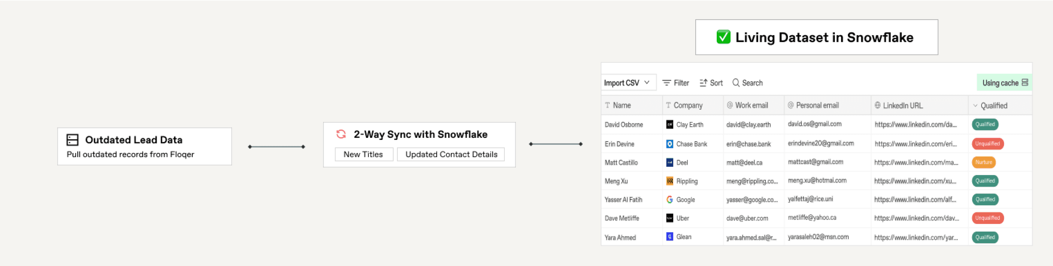 After a few months, we noticed that some of the titles went outdated as people changed jobs — old work emails started to bounce and prospect’s were often confused and replied with “I no longer work there”. This was impacting Perplexity’s campaign’s performance, and brand reputation. Justin was tasked to solve this problem. Floqer team helped Justin configure Snowflake 2-way sync — which auto imported the leads every month, refreshed their titles, contact details, and rerouted if any changes were detected. Justin finally had a living dataset in Snowflake that was used by both product and GTM teams.