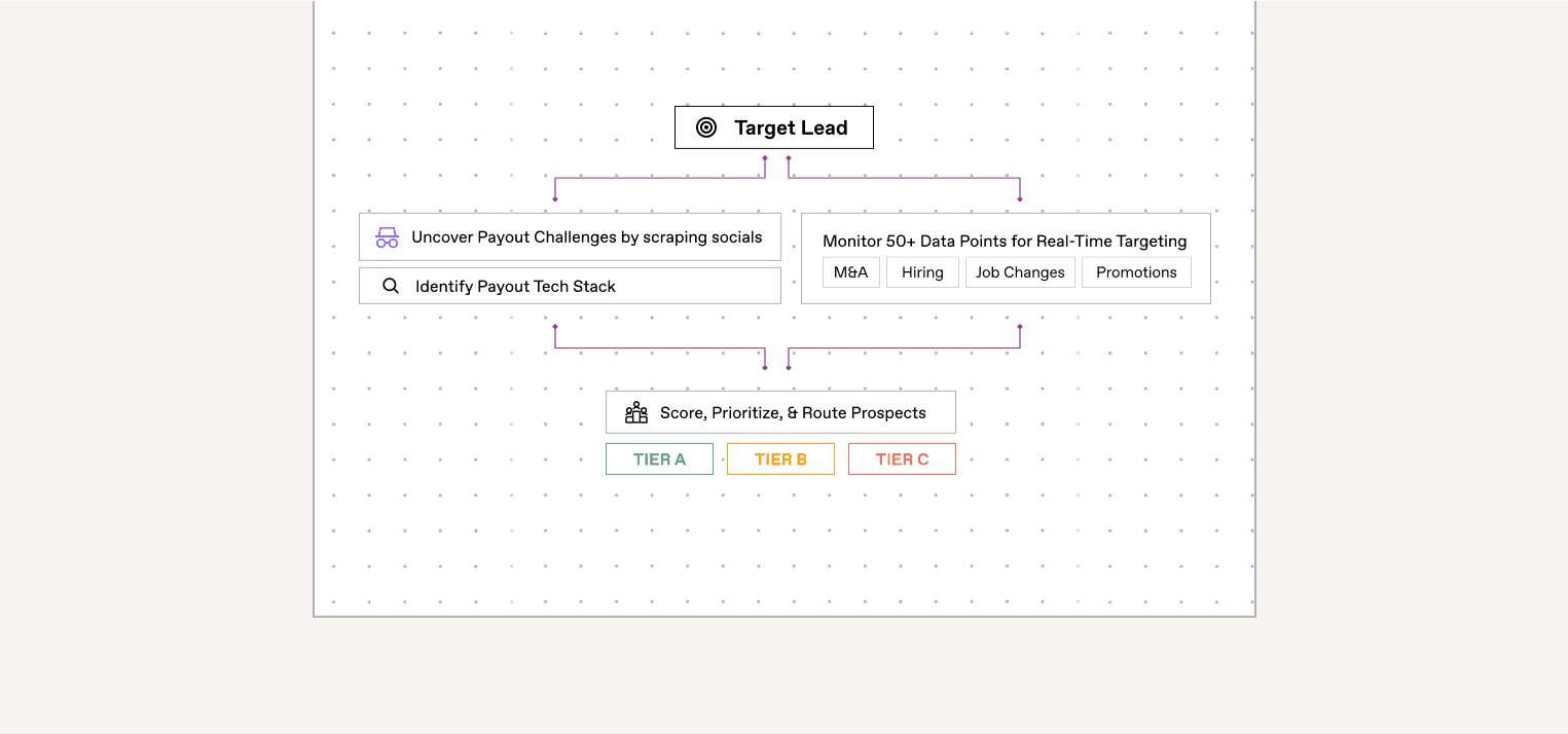 They followed a manual process: review each company’s website, identify the payments tech stack, and scan for intent signals – like open finance-operations roles or recent M&A articles – to surface the best opportunities for the sales team.